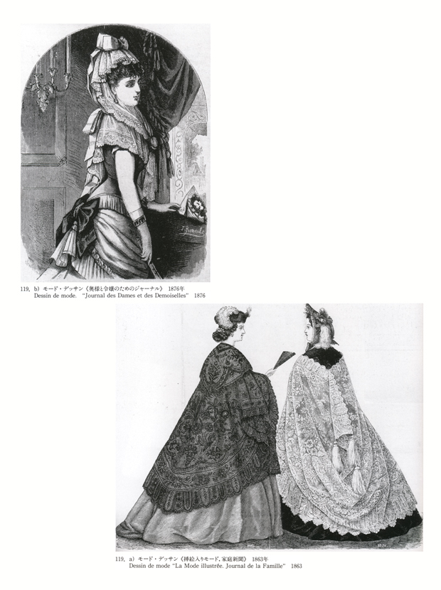 そして先ほどふれましたが フランス・ルーアンの外科医の息子として生まれた ギュスターブ・フローベール ( 1821~1880 )が 1851年9月から4年半かけて推敲したのちの1856年6月から12月まで文芸誌 『 パリ評論 』に分割掲載で発表し、 1857年の起訴と無罪判決を受け4月に出版した小説 『 ボヴァリー夫人 』のなかに出てくる 『 エマ・ボヴァリーが被った黒いレースのヴェール 』 を想わせる婚礼用ヴェールやショールも、しっかり当時のモード版画や家庭新聞の挿絵入りモードなどの資料とともに展示されていました。