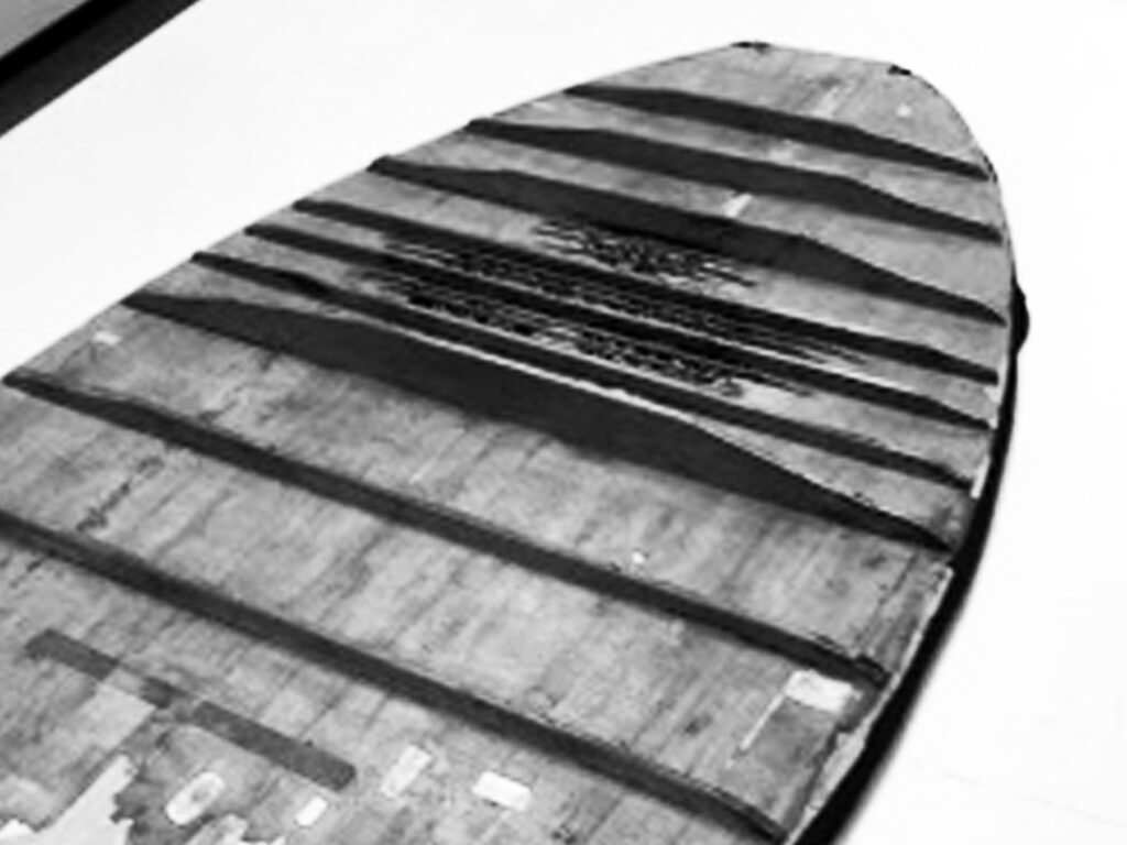 ● 青線は厚さ5.0mmで 青色部はそれより厚い部分で、最厚部は5.5mmとなっています。なお、最厚部はこの表板の重心となっており、表板を水平にして ここをペン先で支えると表板は静止しました。