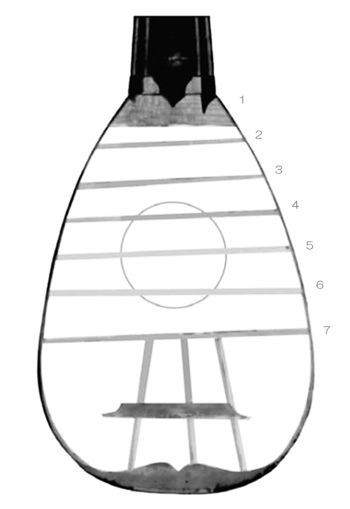 それに対する気配りとして、リュートやマンドリンのような平面響板弦楽器では、表板内側にいれられたバスバー端がサイド側と接触しないように製作されます。