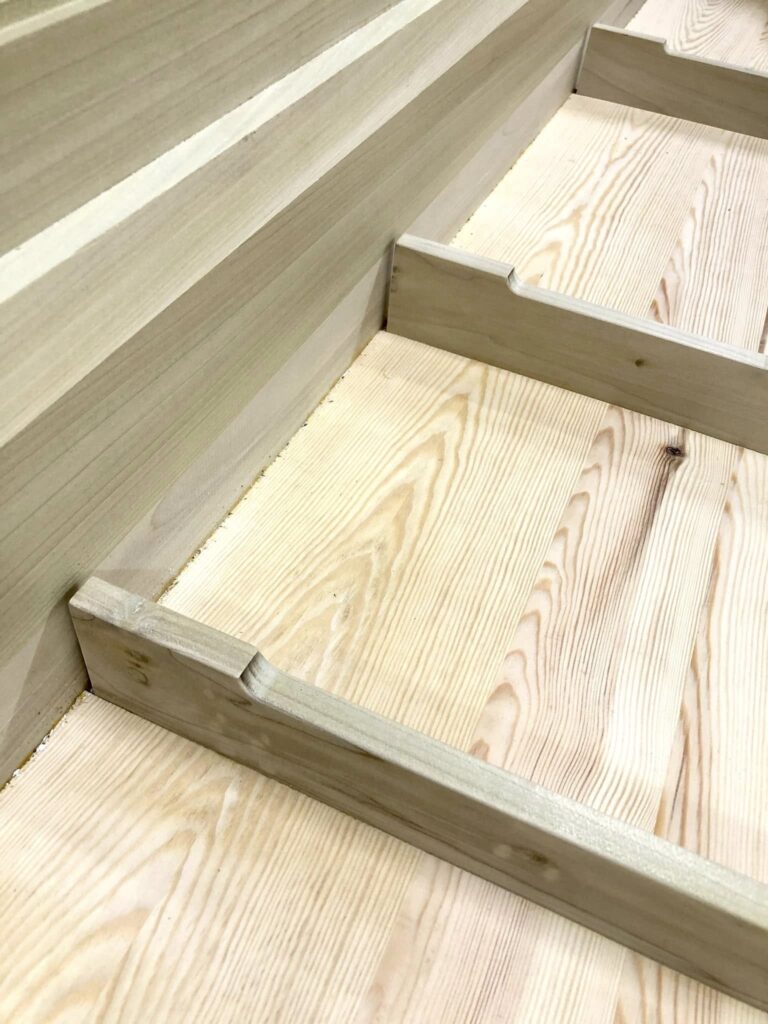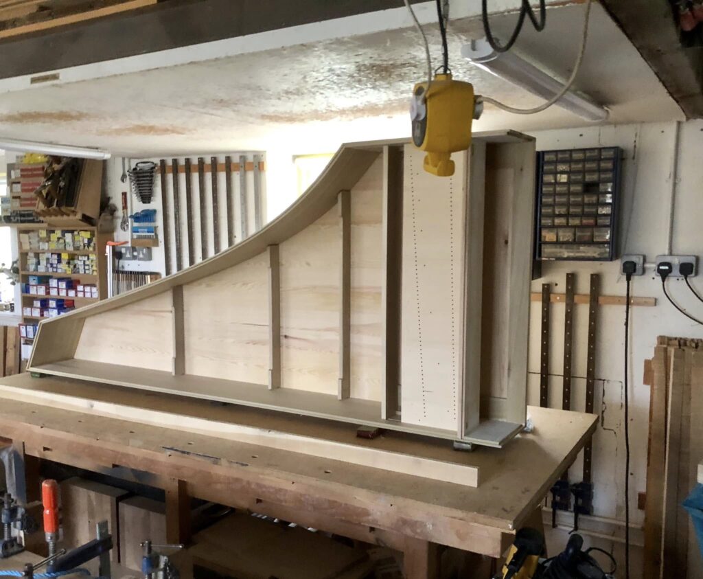 この映像では 箱体部のバランス設定が見えます。なお、横木端には下写真の製作中の横木とおなじようにスペースを設け、側板と接続することで剛性があがりすぎて”ねじり”が阻害されることのないように工夫されています。
