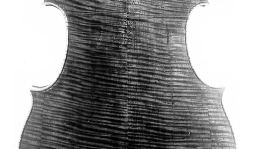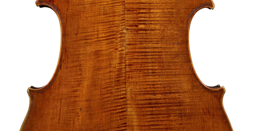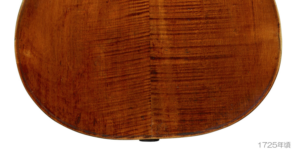 また 木伏(きぶせ)といいますが、 このアマティ・チェロのように 2枚接ぎ裏板でありながら、片側をひっくり返して接合することで 樹木の木理により”ねじり”が強化されたチェロや、ヴァイオリンの存在は重要です。