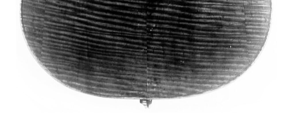 たとえば、能楽で用いる打楽器である”太鼓”は、胴、革、調べ緒からなり、木製の台に掛けて2本の撥(ばち)で演奏します。胴は直径26cm程、高さ15cm程で 欅(けやき)や 栴檀(せんだん)で作られ、革は牛革を用い、胴と革は 調べ緒で連結され、きつく締め上げられています。この”太鼓”の内壁にも 個々に程度の差はありますが、螺旋状の彫り込みを見ることができます。