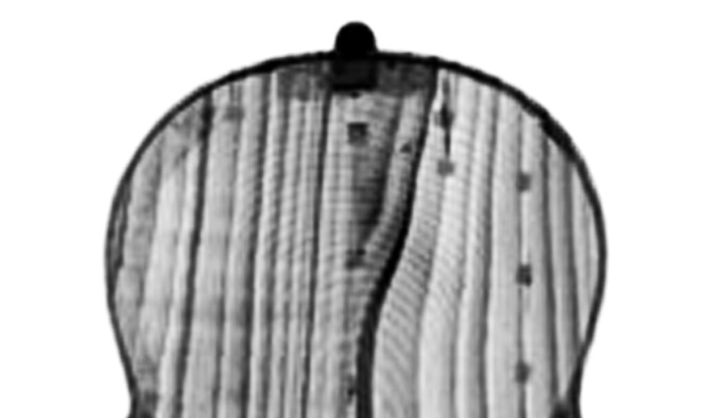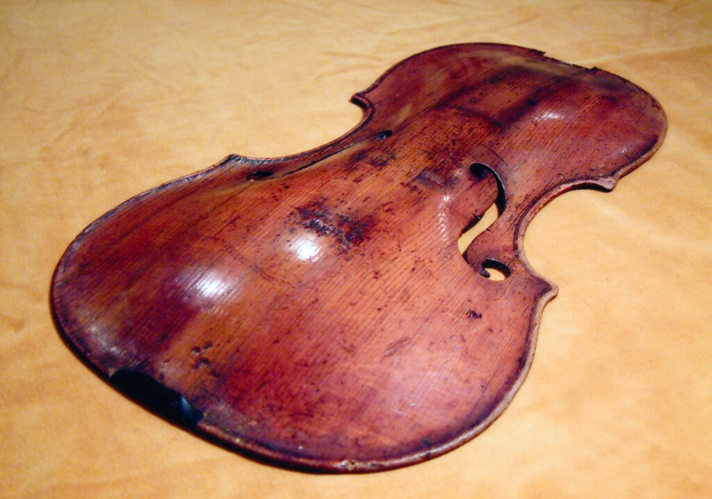 その最中のことです。 私が表板側と側板に気をとられてよくみていなかった 裏板がレイヤー映像のように頭のなかに浮かんだのです。『 表板がこう振動して側板はブロックによって こう動き‥ということは裏板のここら辺りにこういう形状のニスひびが‥』と 独り言をいいながら 裏板を見るために ヴァイオリンをひっくり返しました。