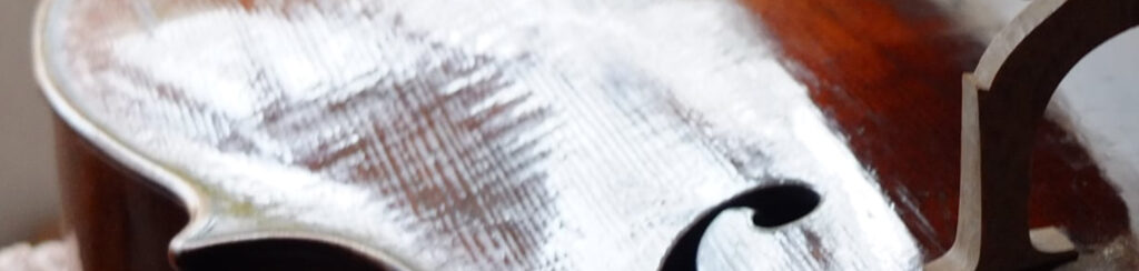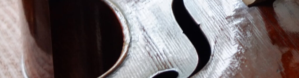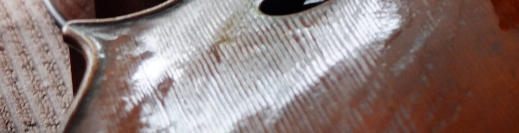 そのとき、ニスのひび割れが キラッ ! と蜘蛛の糸のように光ったのが目にとまりました。はじめは『 なるほど、分数ヴァイオリンでもフルサイズとおなじ入り方をするんだ。』と思いながら観察していたのですが、私が記憶していた他の事例と驚くほど合致していることが分かりました。