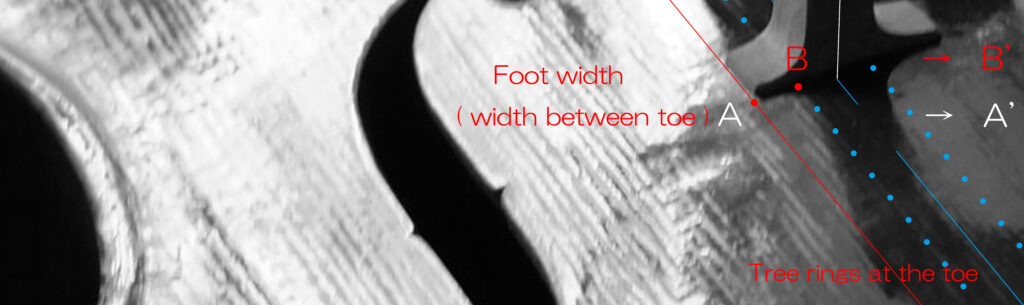 駒を削る技術は”木”と対話し その個性を活かすことが重要で、それは一本の年輪( 赤線 )を、どの位置で終わらせ、この年輪が作用しない区間 A-Bを その年輪全長の どの位置に置き、対となる残された年輪C側と 年輪D側の長さの差や、その下に連なる足部にどのようなキャラクターを与えるかという発想から展開されるものだと思います。