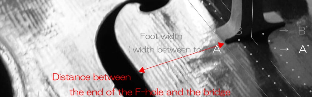 駒足幅はF字孔間に丁度適合することが重要なわけですから、チェロ 92mmとか 94mm、あるいはヴァイオリン 41mm、42mmなどと 数字を前提とすることはありません。