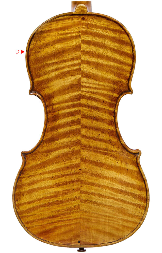 この時、私がはじめに気がついたのは下幅広部に真横に入っているニスひびが テールピースの下で繋がっておらず 魚のウロコ状のニスひびとなっている事でした。