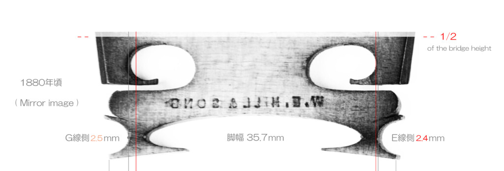 私は まず”駒足幅”として この駒足 狭隘部 ( narrow legs )間の幅を計測することをお奨めします。なぜなら駒足幅は上端に置かれた4本の弦と”対”をなしている為に、音のレスポンスに直結しているからです。