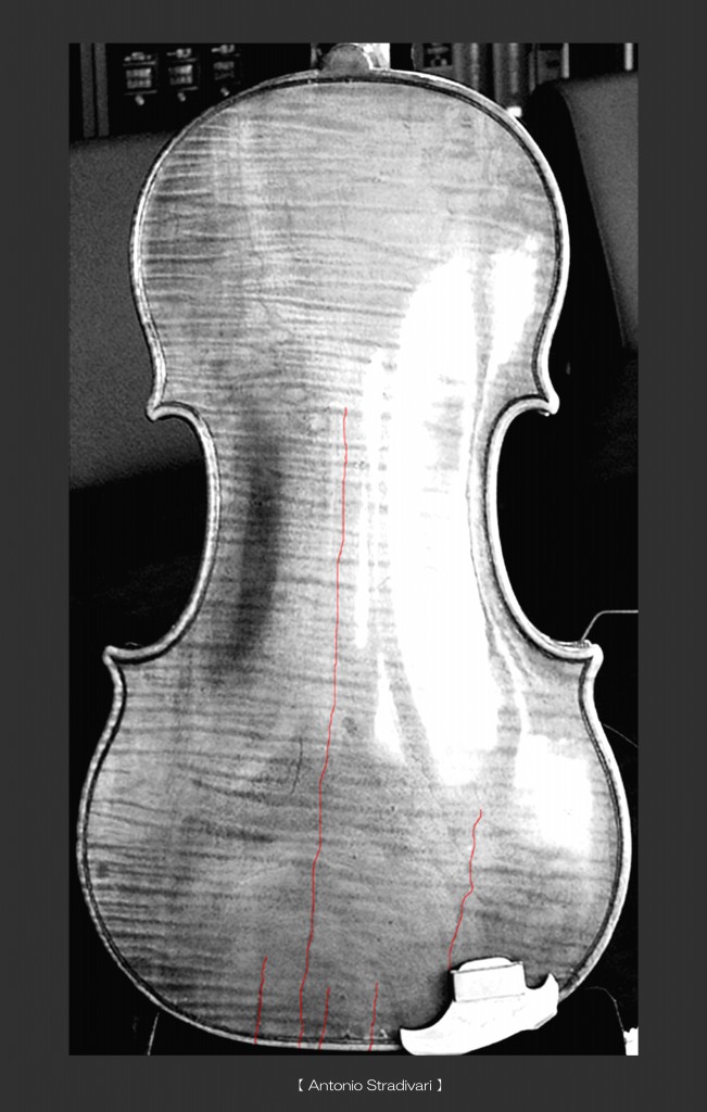 その参考として、撮影時点で割れは修復済みの状態ですが ストラディバリと ヨーゼフ・ガルネリが製作したヴァイオリンに入った割れ痕を赤線で書き込んでみました。