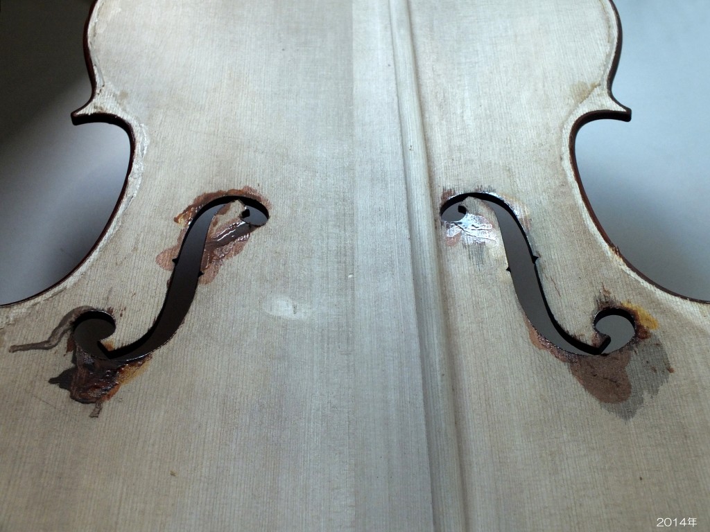 このタイプのチェロを 演奏技術がある方が使用すると、早ければ半年ほどで 表板と側板、あるいは裏板と側板の貼り口や サドル接着部などが剝れます。