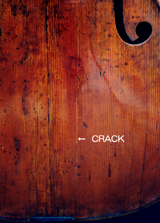 しかし、それらはあまり役には立っていません。その典型は 下の新しいチェロに生じた表板割れに見ることができます。