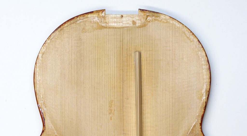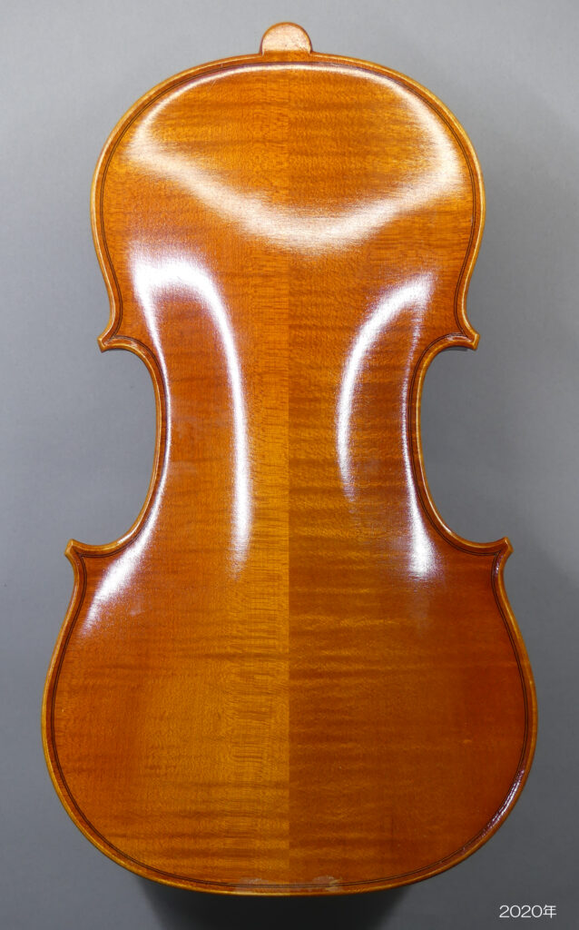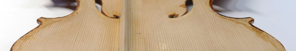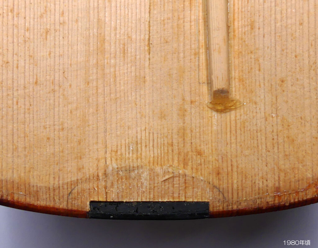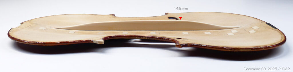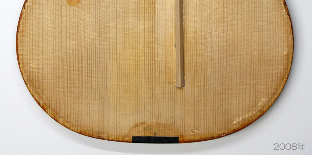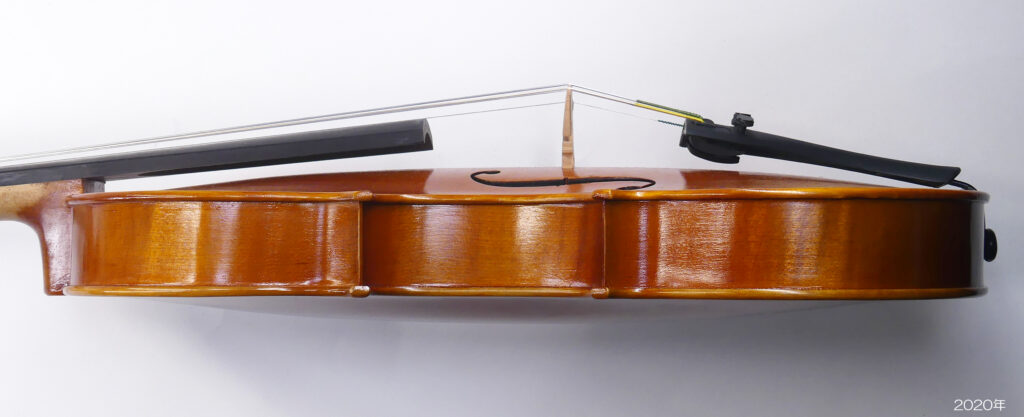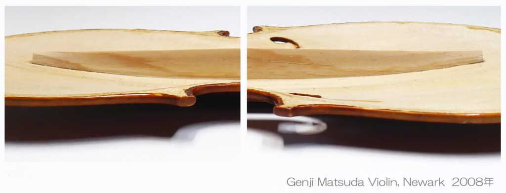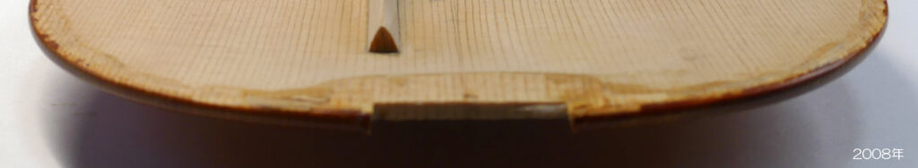 それから、2008年にバスバーの高さが 15.0mmで製作されたヴァイオリンで、16年後の2024年に表板が扁平となりバスバー両端が剥がれたのも同様な事例となります。