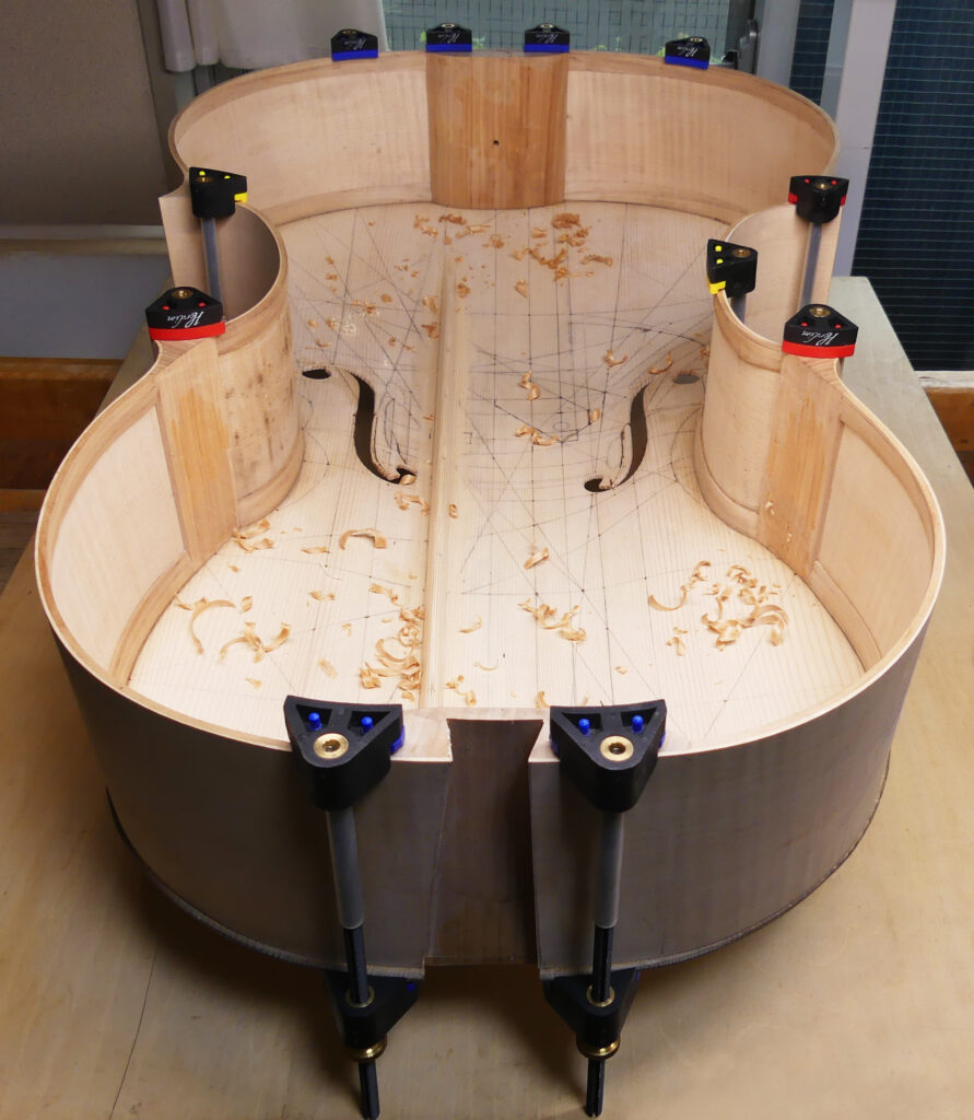 これは 自作チェロですから 不連続形状アーチの剛性も、意図的に設定しています。ですから表板アーチの頂点などと 内部のバスバーは初めから適合する設計となっています。