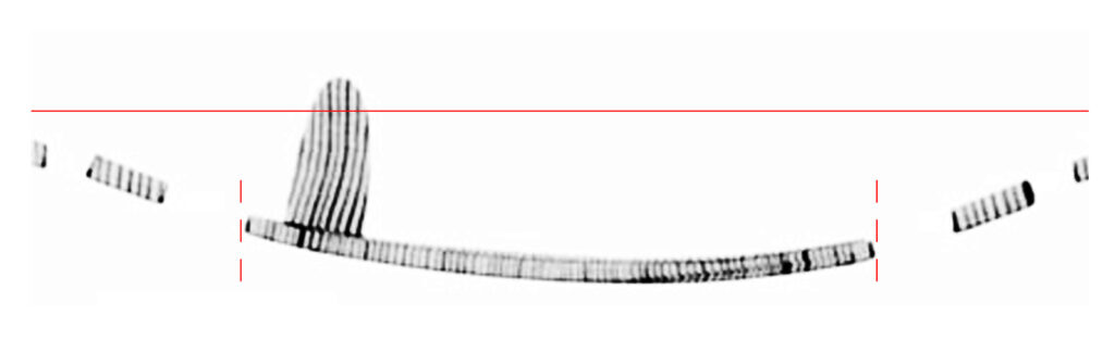 このときに大切なのは、バスバーの頂点を二つのF字孔下端を結んだラインと、全長の1/3分割ラインに挟まれたゾーン付近まで下げて、強い非対称型として 響胴の”ねじり”を誘導することです。