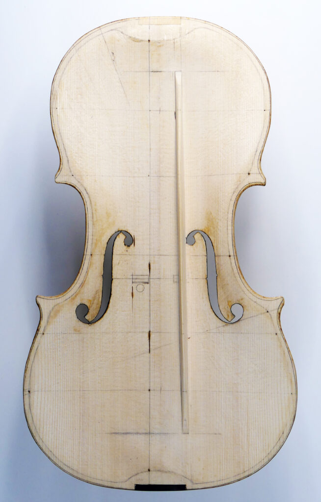 また、これは自作チェロですから 不連続形状アーチの剛性も、意図的に設定しています。ですから表板アーチの頂点などと 内部のバスバーは初めから適合する設計となっています。