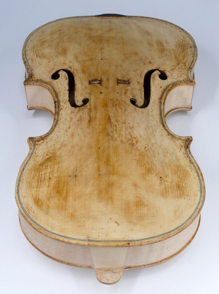 私が、2025年に製作したチェロに鍛造鉄釘を埋め込むときも、このヴァイオリンと同じやり方で、埋め込む鍛造鉄釘そのものを加熱して釘穴の成型をおこないました。
