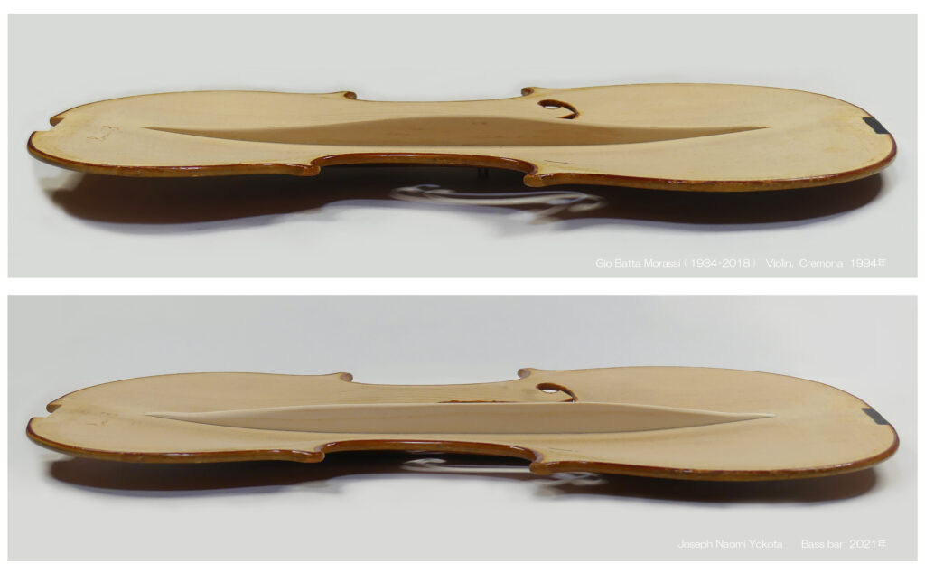 それから時が経ち、ヴァイオリン、ビオラ、チェロでバスバーをいくつも製作し さらに検証を進めた結果、レスポンスや響きのキャリング力を高めるためには、やはり 高さを最大化することが重要だと確信するようになりました。