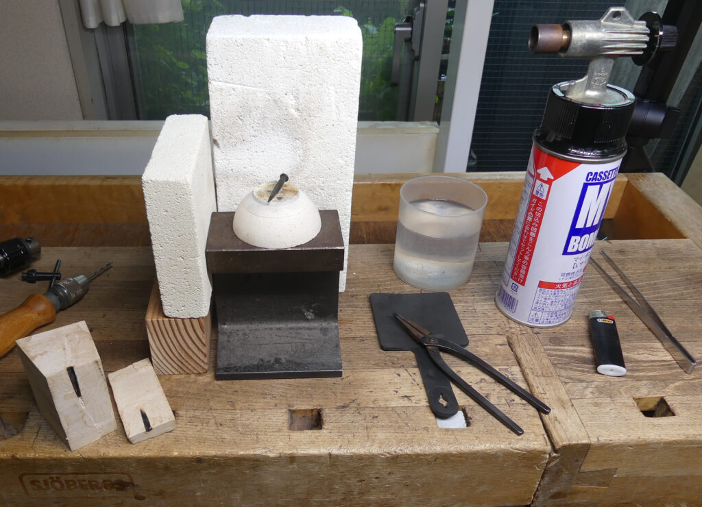 私が、2025年に製作したチェロに鍛造鉄釘を埋め込むときも上の実験と同じやり方で、埋め込む鍛造鉄釘そのものを加熱して釘穴の成型をおこないました。