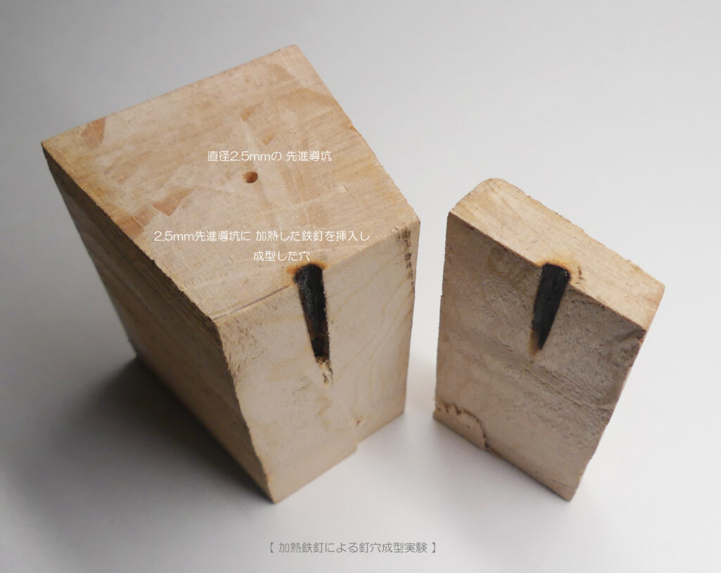 下写真は、私が 加熱加工で釘穴を成形する実験をしたときのものです。