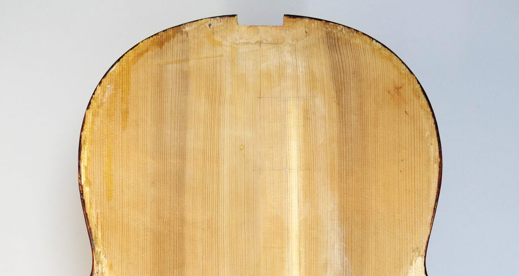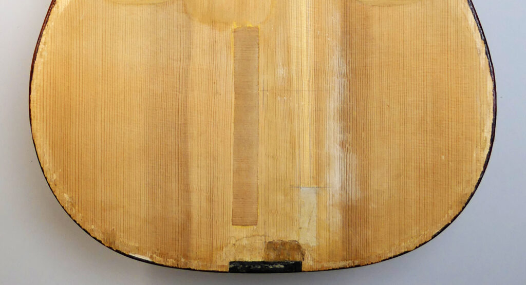 写真でわかるようにバスバー両側が完全に剥がれていて、指板下の表板ジョイント部も 140mm程にわたり開いていました。