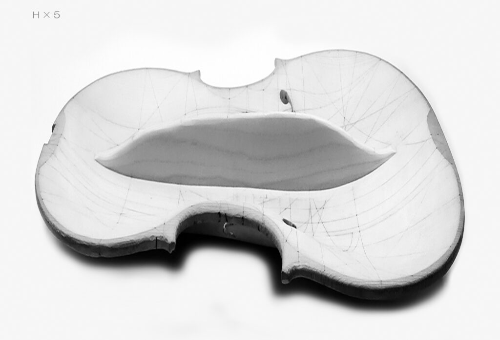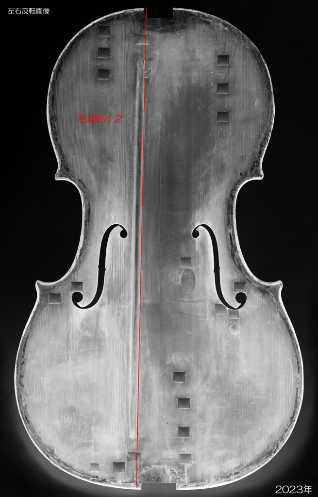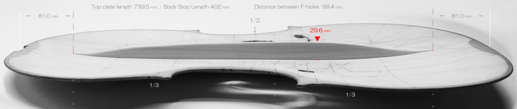 このときに大切なのは、バスバーの頂点位置を二つのF字孔下端を結んだラインと、全長の1/3分割ラインに挟まれたゾーン付近まで下げて、強い非対称型として 響胴の”ねじり”を誘導することです。Joseph Naomi Yokota  Cello, Tokyo anno 2025