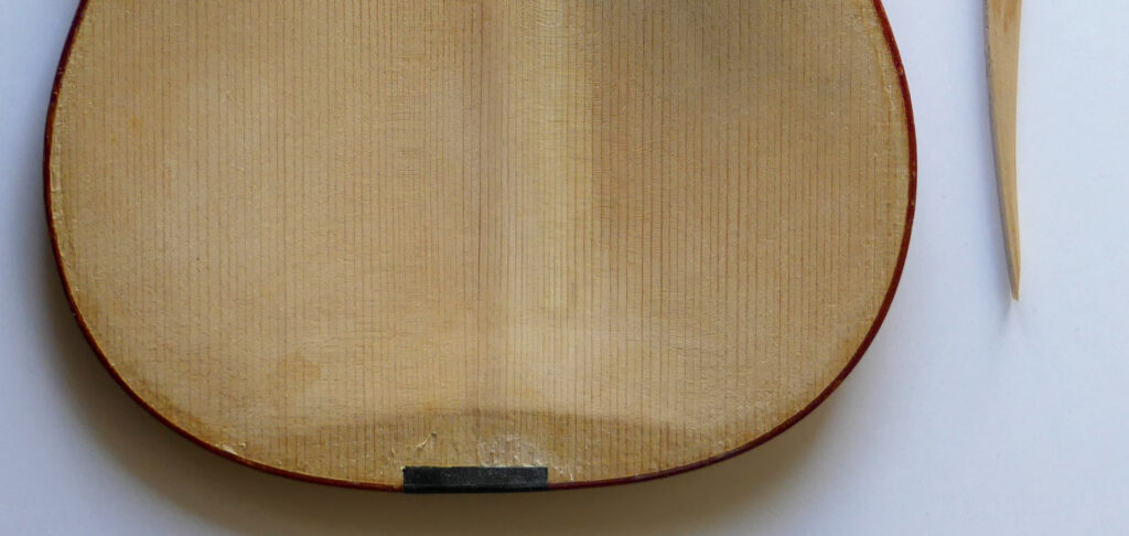 技術的にも左手で表板を水平に保持し軽くゆらして反応をみながら、望ましいと考えられるポイントを彫り込み、表板のゆれ方が より”しなやか”であるように工夫するだけですので それほど難しくありませんでした。