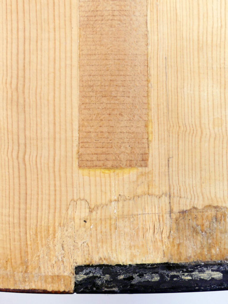 しかし、これらのバスバー剥がれは表板の”つり合いの破れ”が原因ですから、そのニカワ加工により歪がより増大し バスバーが反対側( 上写真 サドル中央左 )の割れを誘引したり、中央の継ぎ目が開いたりします。このヴァイオリンは30年以上使用されていなかったために、製作されてから“45年後”にバスバーが入れ替えられたことになります。