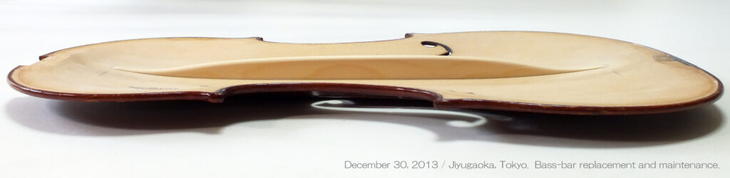 そのような事柄を念頭に置いた上で、検証実験として2020年製 表板アーチが16mmの”起伏に乏しいタイプ”として製作された新品ヴァイオリンを改作し、バスバーを 高さ14.8mmで作り響きなどの確認をおこないました。