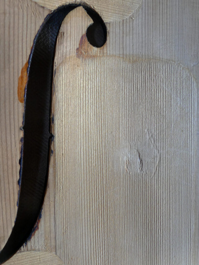 私が、2025年に製作したチェロに鍛造鉄釘を埋め込むときも、このヴァイオリンと同じやり方で、埋め込む鍛造鉄釘そのものを加熱して釘穴の成型をおこないました。