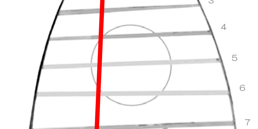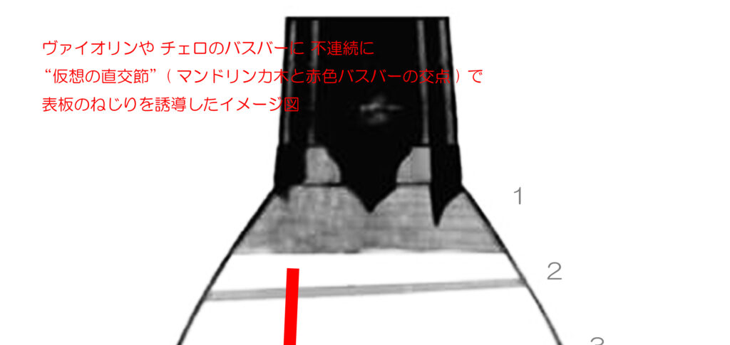 上図の赤色で表したヴァイオリンや チェロバスバーに”仮想の複数バスバー”が直交するポイント 6~7カ所で、その断面形状… 特に尾根部の不連続成形をもって 表板のねじりを誘導するという発想はなかなかすばらしいと思います。
