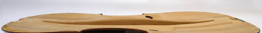 悲しい状況証拠ですが、この”ピグマリウス”は 響胴の変形疲労のために、魂柱( Soundpost )が立っていた部分が表板、裏板ともに窪んでいました。これこそ、バスバーが響胴と調和しておらず”鳴らすと壊れてしまうヴァイオリン”の典型例だと思います。