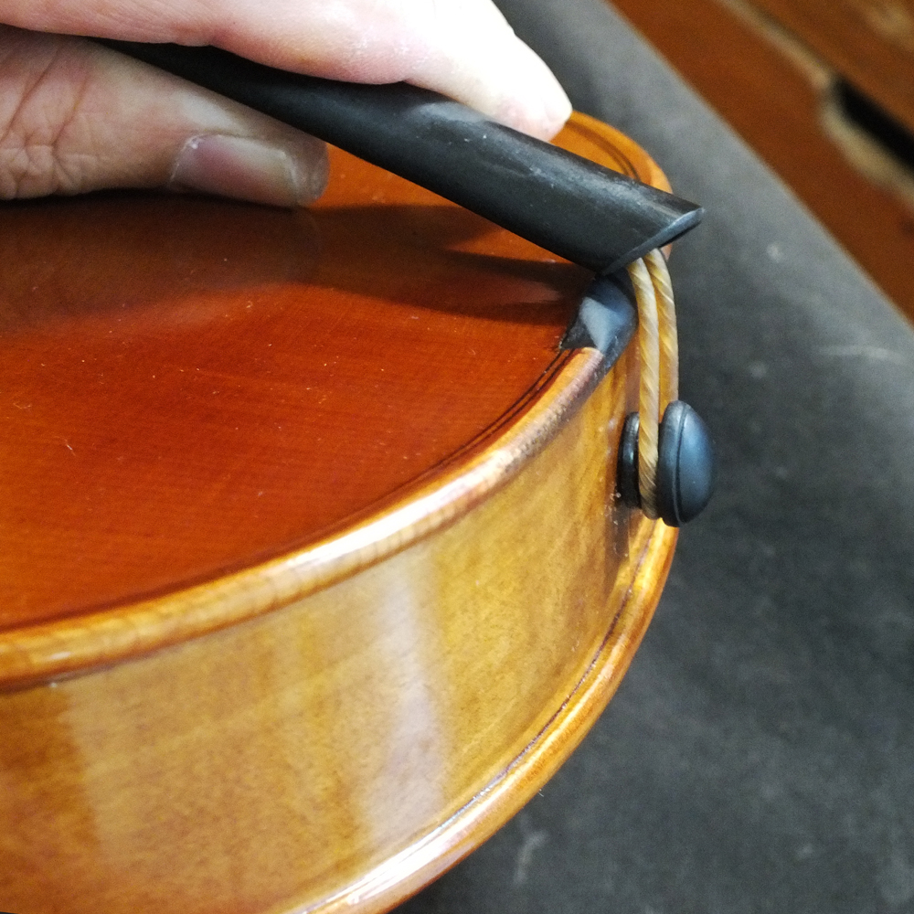 ヴァイオリンのテールピースに開けられているテールガット穴部は それほど丈夫ではありません。ガットを絞め込む際には 決して”テコ原理” を使わないでください。