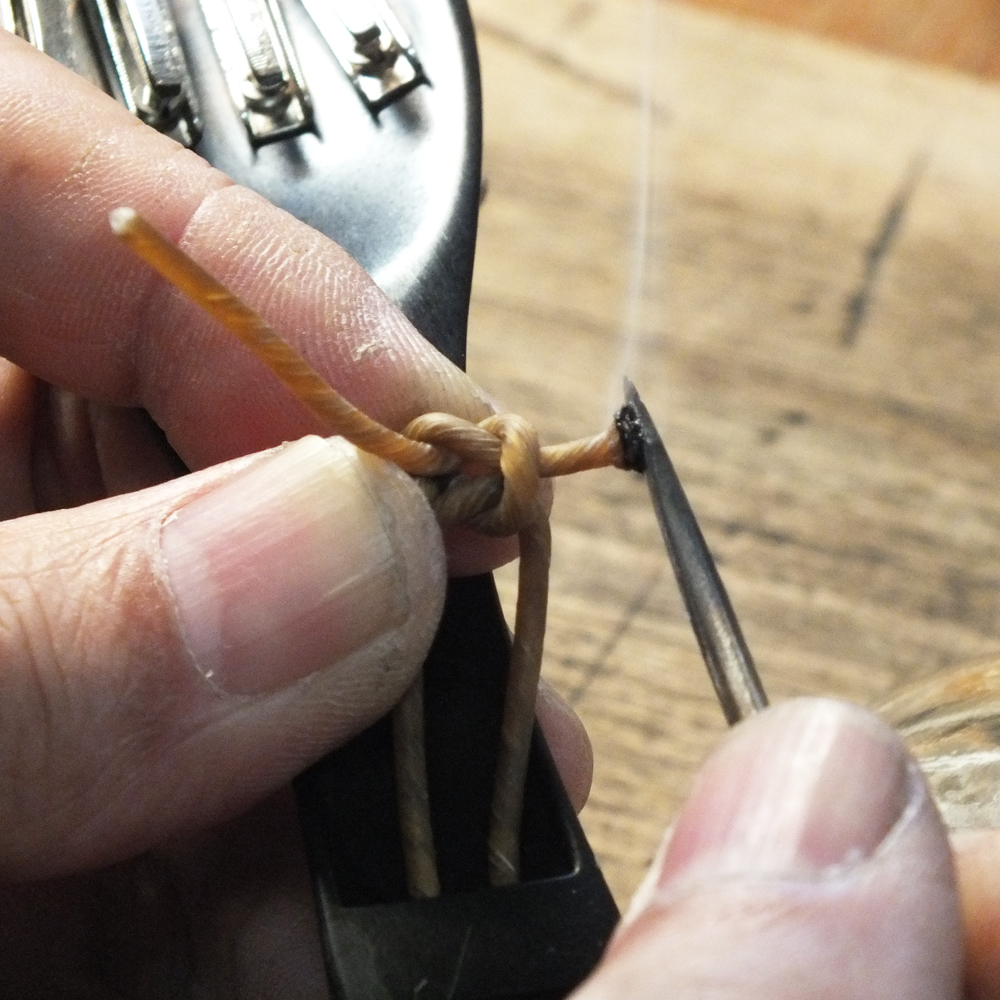 私はこれを避ける為に 不要になった音叉を利用して締め込みをして、最後に本結びがゆるまないように そっと曲げて仮組準備を終わります。